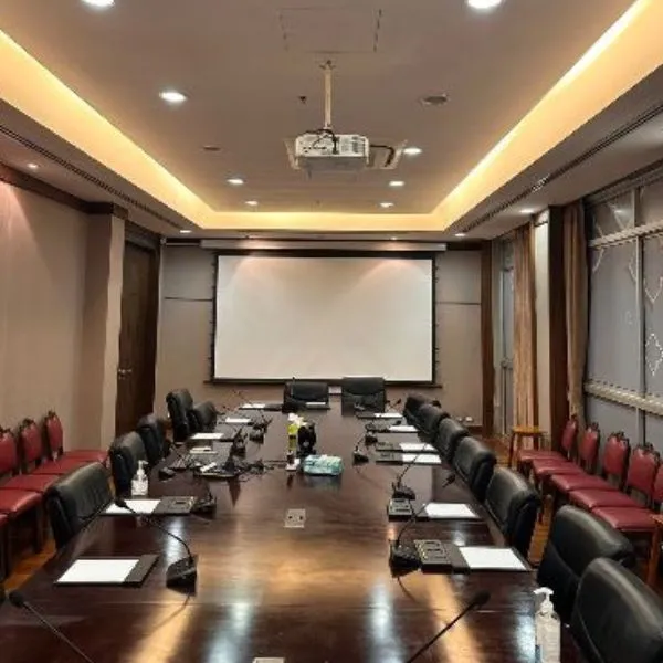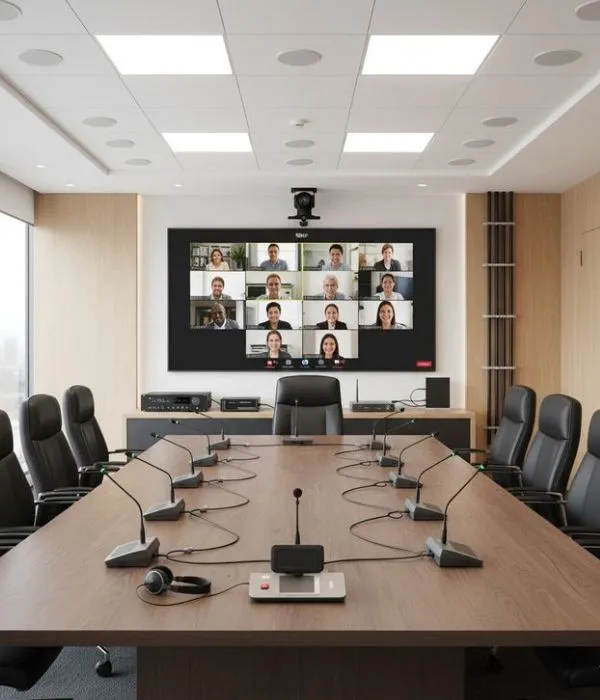 A fully integrated conference room solution with noise-free microphones, digital mixers, speakers, and seamless audio distribution.